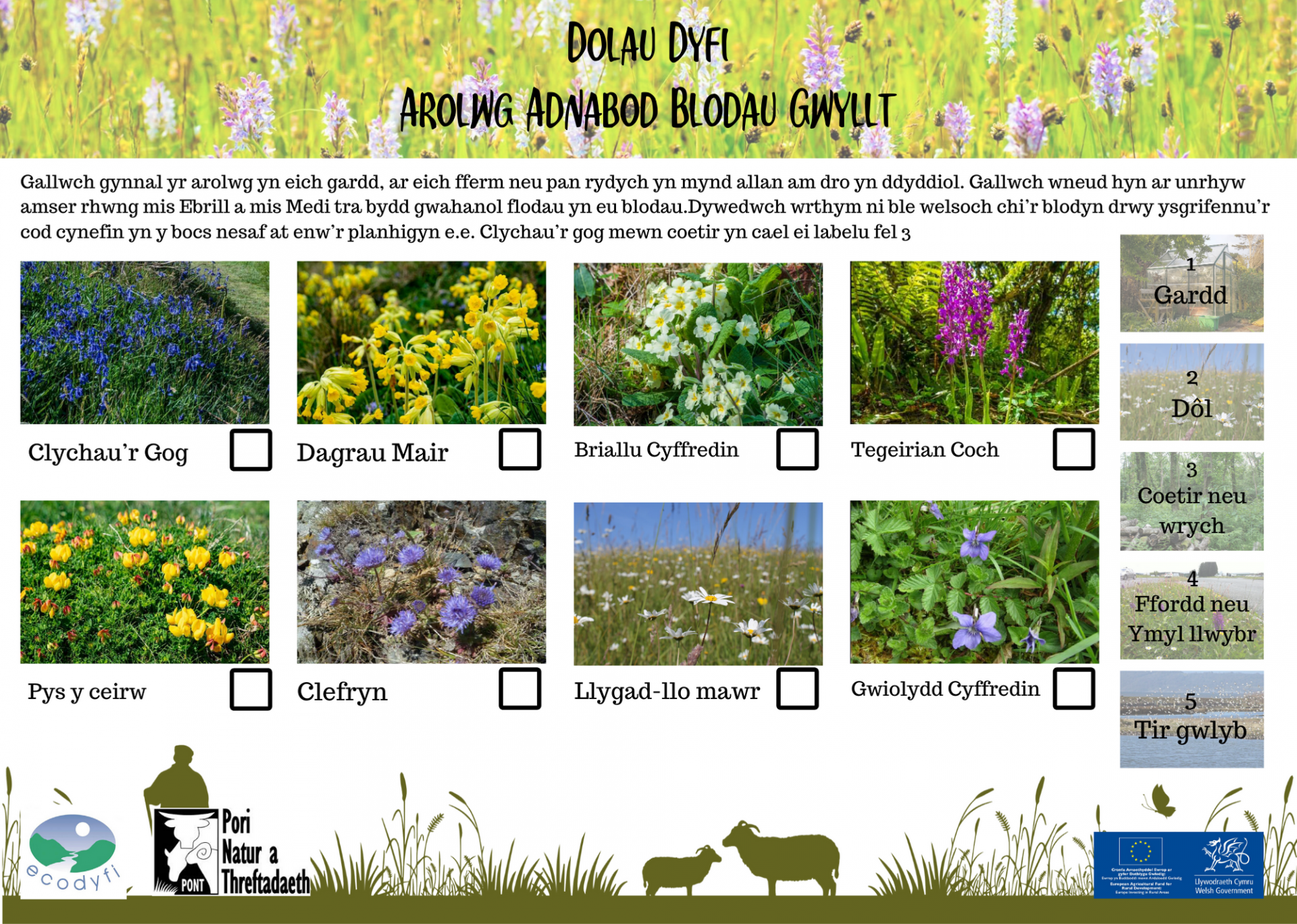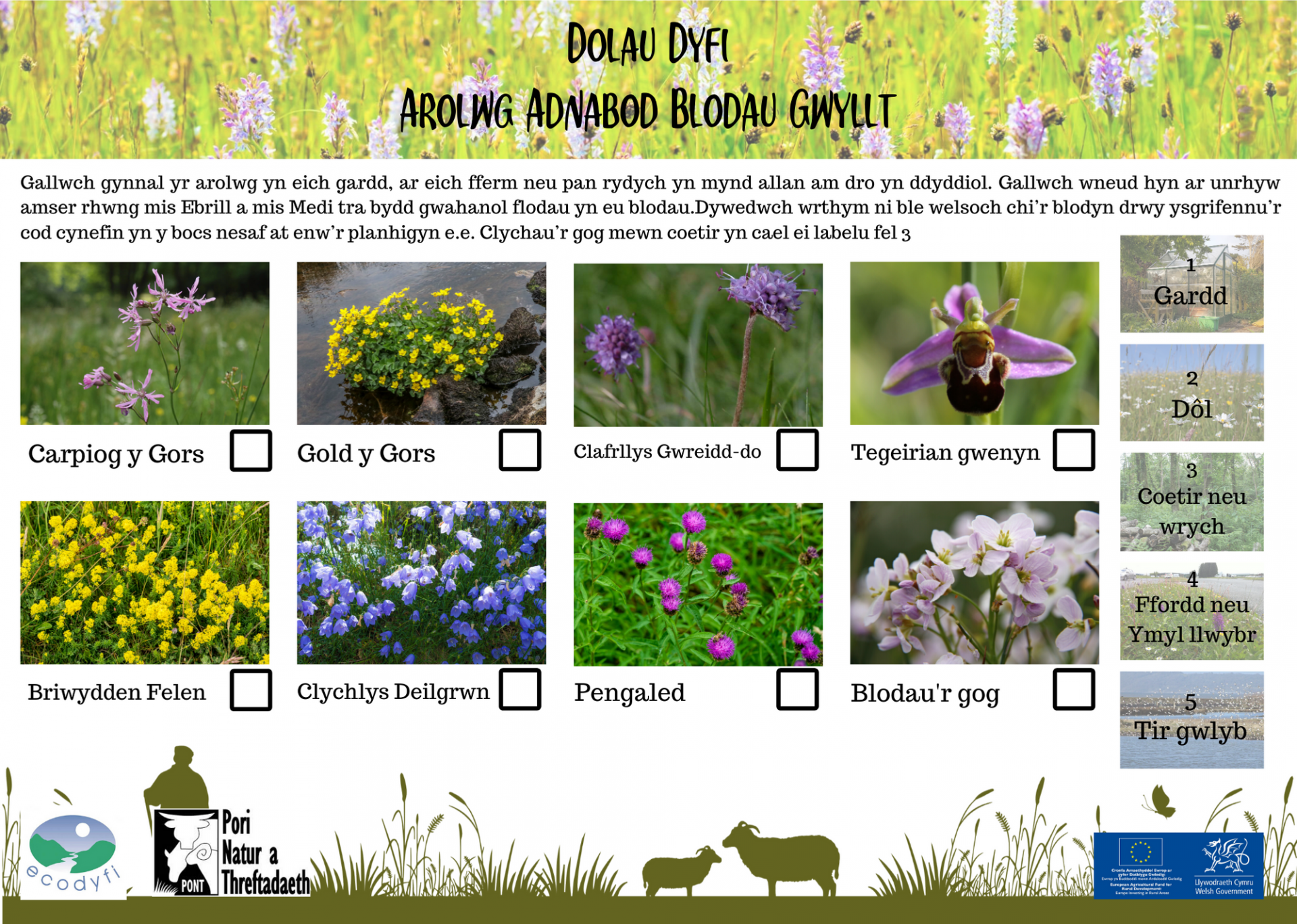 Helpwch ni i archwilio ardal prosiect Dolau Dyfi drwy gymryd rhan yn ein harolwg Dolau Dyfi Wildflower Spotter Survey Cym